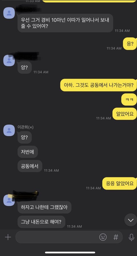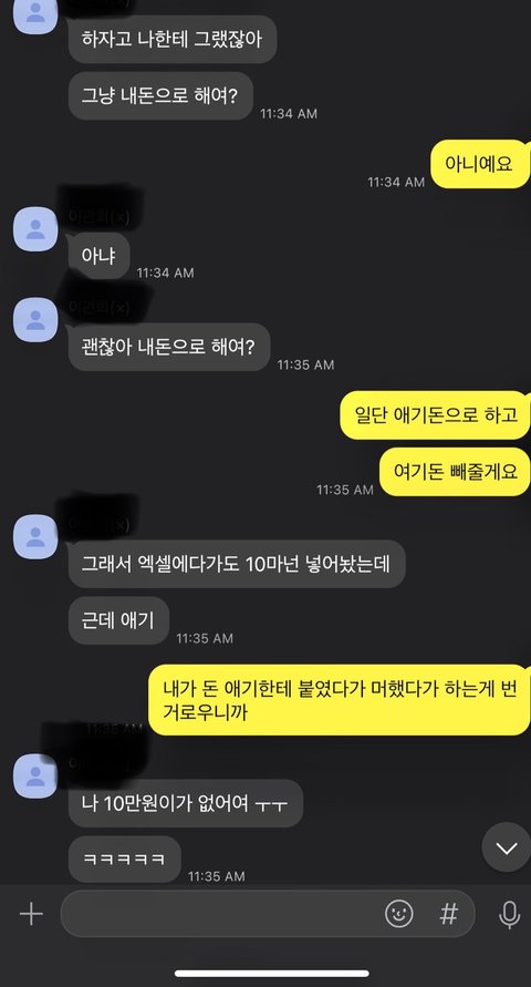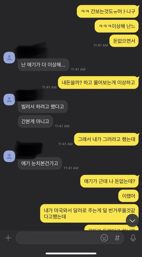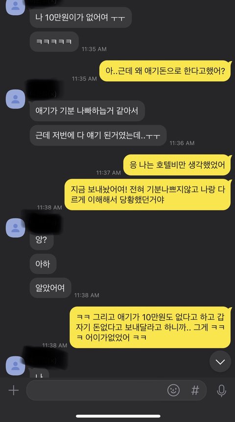 남친도 내가 당황한거 느꼈는지 "그냥 내돈으로 할까?" 라고 말함. 나는 그정도는 경비에서 나가는 거 상관없다고 생각함. 내가 한국돈으로 보내주고 하기가 번거로워서 남친 돈으로 쓰고 오면 달러로 주겠다고 말함. 근데 남친이 갑자기 10만원이 없다고 하는거임. 그래서 돈을 보내달라고함.