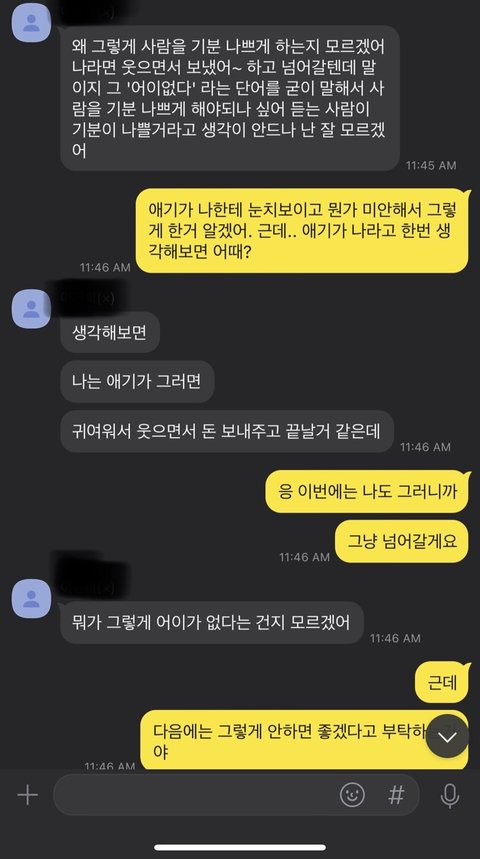 그래서.. 이번일은 서로 잘못이해한거고 오해에서 비롯된거니까 괜찮은데 다음번에는 나한테 뭔가 해줄상황이 안되거나 본인 상황이 좋지않으면 능력밖에 일을 무리해서 말하지말고 차라리 솔직하게 말해달라고 부탁했는데 내가 자기 돈없다고 이야기했을때 내가 어이없다고 말한거 사과하라네. 자기는 나를 배려해서 한말이니까 거짓말이 아니래. 내가 그거 공동경비인데 왜쓰냐고 하면 돈빌려서 가려고 했으니까 거짓말한것도 아니래.