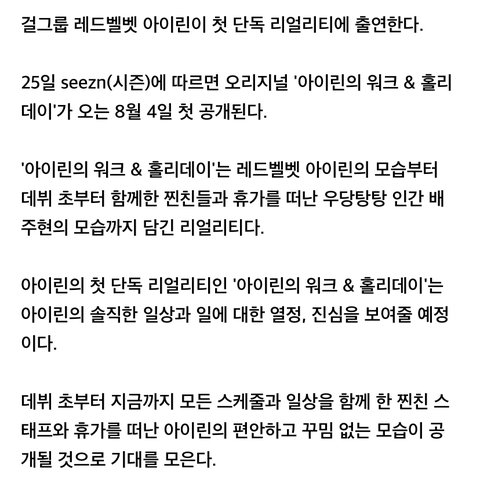 레드벨벳 아이린 첫 단독 리얼리티 출연