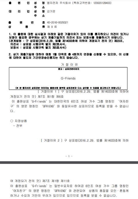 1. 상표권 아직 거절 당한 것이 아닙니다. 쏘스뮤직이 'GFRIEND' 상표에 대해 신청을 했고 거절 사유에 대해 의견을 달라고 통보받은 상태입니다. 의견 제출기한은 9월 13일이고 4달 더 연장 가능합니다.