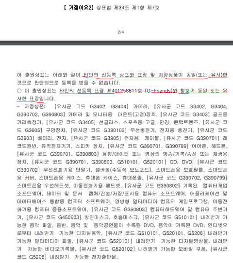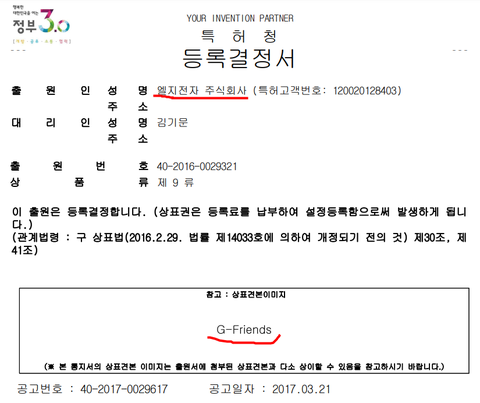 3. G-Friends 상표권은 엘지전자가 가지고 있는 상태입니다.엘지전자도 이번에 쏘스뮤직과 같은 사유로 거절 사유에 대해 의견을 달라고 통보받았는데 의견서를 냈더니 상표권이 등록되었습니다.