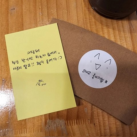 라는 글귀가 적힌 포토카드와 마시고 울지 말라는ㅋㅋㅋ 컵홀더를 나눠줌
