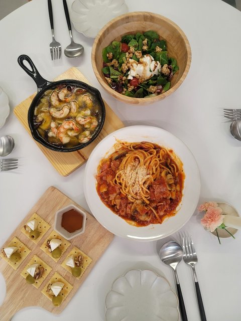 리코타치즈샐러드, 카나페, 토마토파스타, 감바스, 토마호크 준비했어요.