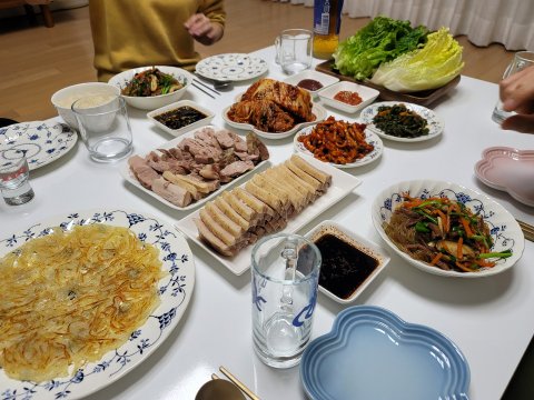 감자전, 보쌈, 잡채했는데 생각보다 부족해서 추가로 삼겹살 구이까지 했어요.
