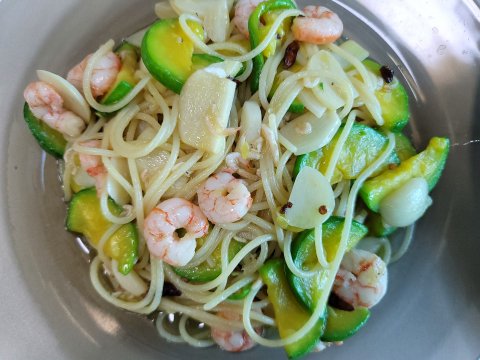 애호박새우젓파스타에요. 오일에 마늘 볶다가 새우 넣고, 소금에 약간 절인 애호박 넣고, 면 넣어주세요.(이때 면수도 조금 넣어주세요.) 새우젓을 약간 넣어주면 감칠맛도 살고, 간도 딱 적당하게 잡아줘요.