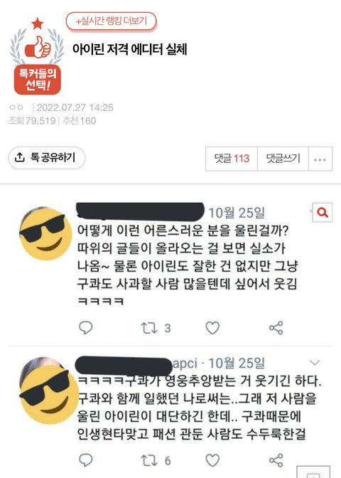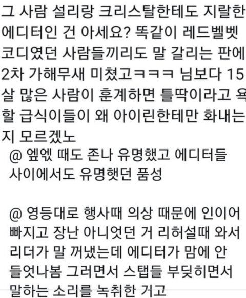 (같은 글임. 똑같이 인증 없는 가계정인데 아이린 욕하는건 다 주작이라면서 에디터 욕하는건 동종업계 사람들~ 이라고 말하는데 이게 맞음 진심..?)