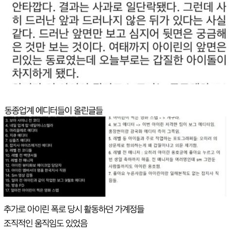 그 외 에디터 2차가해를 조지게 해댔는데 설리 크리스탈 욕한 에디터다, 영동대로 무대때 아이린 마이크를 떨어지게 한 스타일리스트다 등등으로 아이린의 갑질을 정당화(?) 하려는 쉴드를 치다가 결국 에디터가 등판해서 직접 해명글을 쓰게함
