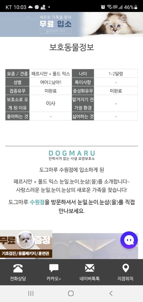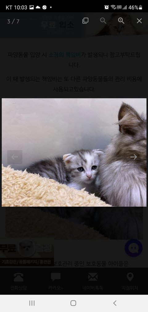12/21 게시된 "우리집 캣 우먼 소개드려요"에 많은 관심을 가져 주셔서 감사합니다.저희 냥이가 너무 이뻐서 유기묘가 아닌것 같다는 분들이 계셔서 인증샷과 돌이 지난 르블랑의 현재 모습을 공개합니다. 여러분들도 아갱이 유기묘를 입양 원하시면 자주 주 2회 이상 보호소를 방문하셔요~예약이 안되어 운이 좋으면 4-6번 방문에 요렇게 예쁜 아가를 입양하실 수 있습니다. 유기묘라고 해도 책임분양제는 조금 발생해요~ 우리 르블랑의 경우는 성묘3마리를 키우던 집에서 그 중 페르시안이 폴드아빠와 3마리를 출산하였고 그중 막내(눈삼)가 다리가 불편해서 다른 2마리는 건강했지만 요 아이를 데리고 입양했습니다. 그래서 저희 아이는 스코티쉬폴드는 아니예요~~응원해주셔서 건강하게 잘 자라고 있습니다. 오늘은 유기묘 입양 인증샷과 르블랑의 엄마 페르시안, 오빠, 언니도 보여드리고 건강하게 애교냥이로 자라고 있는 르블랑의 1년 자란 성묘 모습을 공개합니다. 엄마옆에 꼭 붙어있는 아이가 제가 입양한 막내예요. 그때는 다리가 불편한지 언니, 오빠들과 잘 못 놀고 엄마 옆에만 붙어있더라구요. 그리고 입양한날 사진 찍으신분은 블랑이 대부님이십니다~~