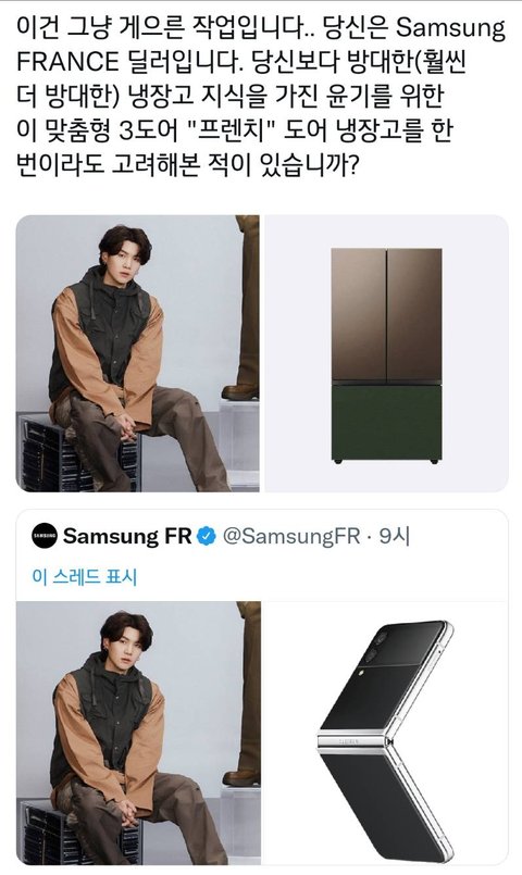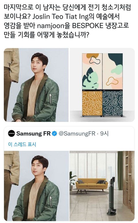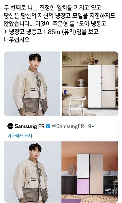 삼별이 계정에서 애들 사진으로 자사제품하고 같이 올렸거든ㅋㅋㅋ 그랬더니 석지니 냉장고 계정이 더 적절한 제품이 있는데 왜 일 제대로 안하냐고ㅋㅋㅋ 알맞은 제품들 찾아와서 인알ㅋㅋㅋ 이때 웃겼어ㅋㅋㅋ