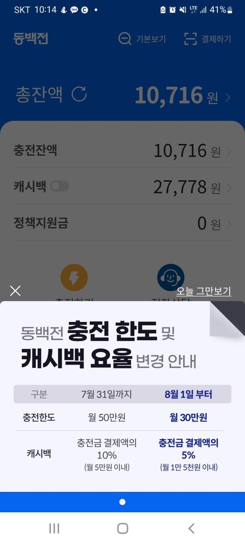 화력강한 결시친에 써봐요. 부산 동백전 기존 50만원 한도 사용시 5만원까지 캐시백에서 8월부터는 월 30만원 한도, 충전금 결재액의 5%, 월 15,000원 이내까지만 캐시백 됩니다. 서민들은 더욱더 허리띠 졸라매야 겠습니다. 부산지역은 왠만하면 동백전 사용 많이하는데 결국 줄여버리네요.