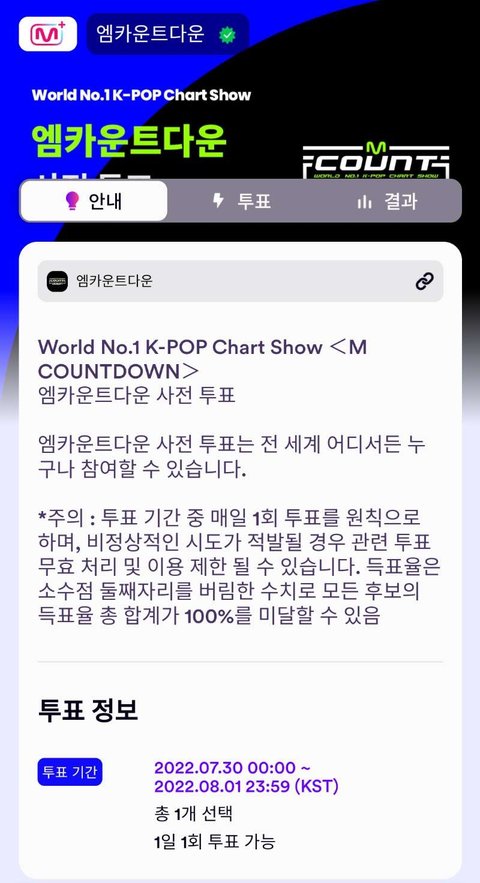 오늘부터 시작이니깐 꼭 챙기자! 1일 1표 할 수 있오! https://www.mnetplus.world/community/vote?voteId=wG9giwvv0RJQD-nEzqgiN