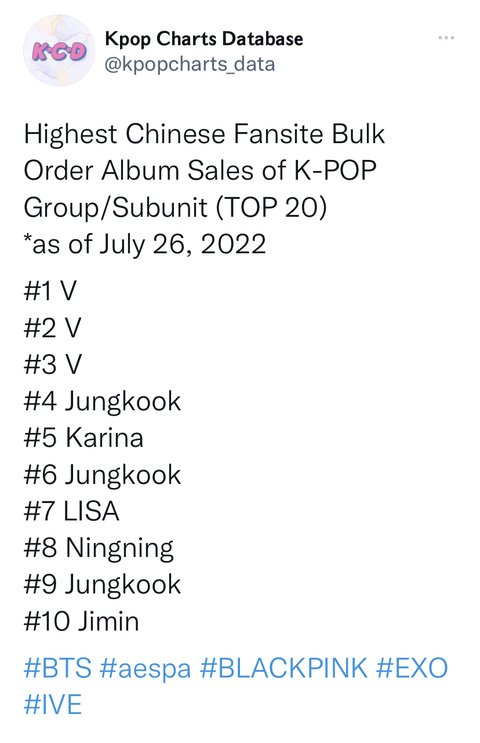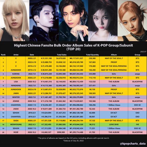 Highest Chinese Fansite Bulk Order Album Sales of K-POP Group/Subunit (TOP 20)