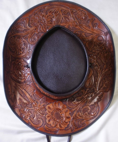 가죽에 플라워 디자인을 카빙하고 엔틱염색을 하여 수작업으로 제작한 클래식 카우보이 가죽 모자입니다.(마디샤)
