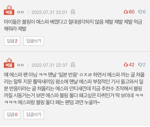 블핑한테 표절이라고 하는 글 마이가 올린것도 아닌데 댓글들 마이탓 오지네 ㅋㅋ 숨만쉬어도 까이는 에스파 팬들이 굳이 왜 판에 그딴글을 올리겠냐?