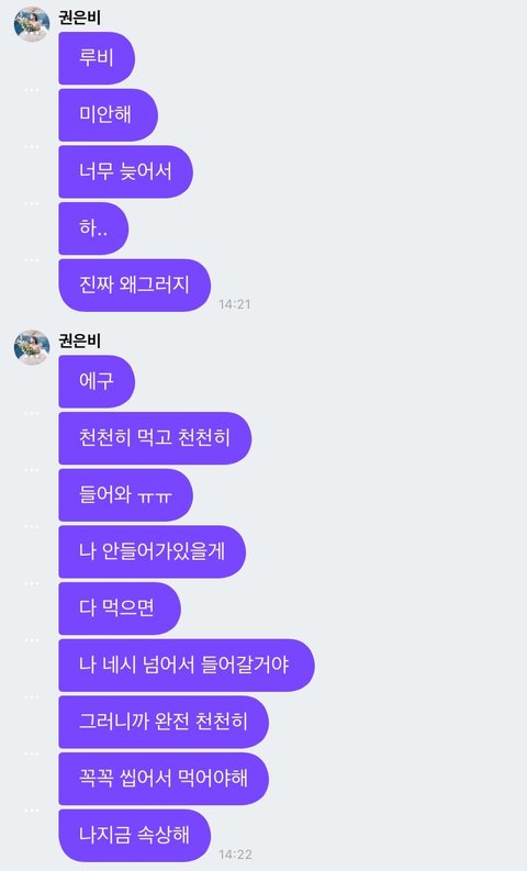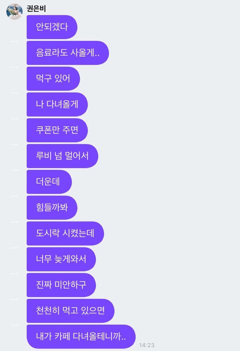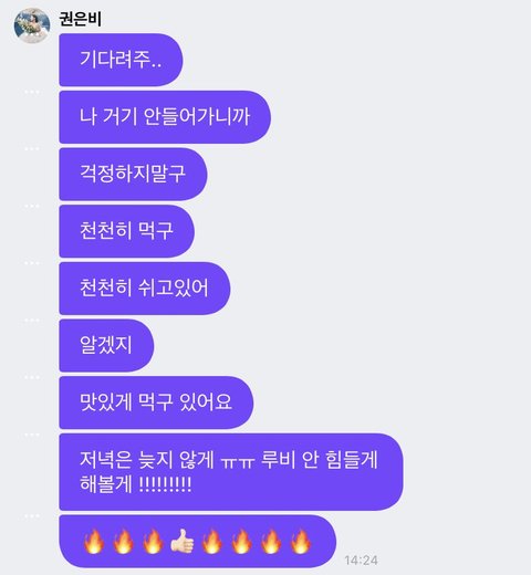 그리고 자기 네시까지 안 들어갈테니까 밥 천천히 먹고 오라고 프메 보내줌 감동 쩌러..
