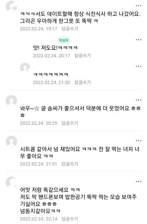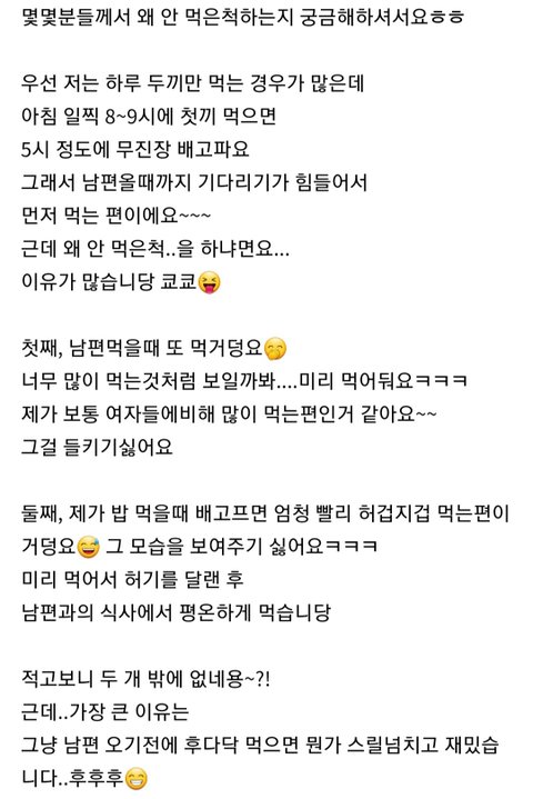 항상 남편오기전에 국에 밥말아먹고 안먹은척을 하는데 남편이 연락 없이 일찍 오는바람에 밥먹은걸 들켰다는 글에 사람들이 왜 안먹은척하냐고 물어봐서 그에 관해 대답하는 내용..