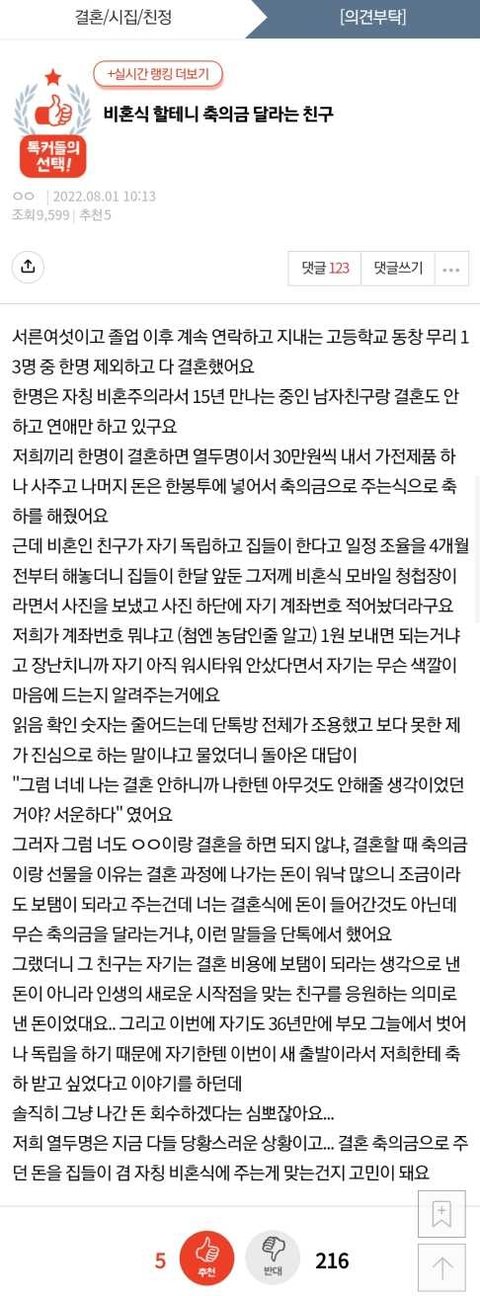 비혼식 할테니 축의금 달라는 친구