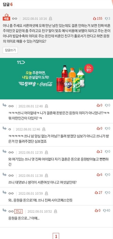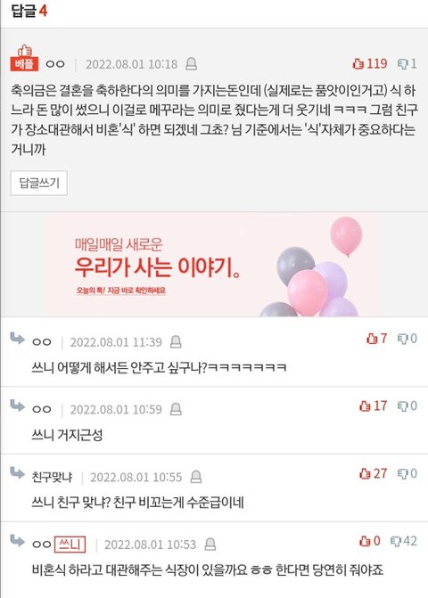 바보들이 ‘ㅇㅇ이는 결혼 안하니까 돈 굳었네 히히” 이랬나봄. 그 ㅇㅇ이가 너네처럼 이기적인 친구들한테 30x12=360 만원을 왜 거저 줘야하냐. 차라리 기부를 하겠다.