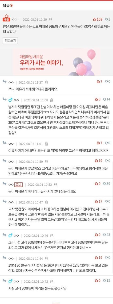 와 나쁜냔들 지들은 다받아 쳐먹고 뭐? 30받고싶으면 결혼을 하라고? 뭐 저런 신박한 또라이냔이 있냐?