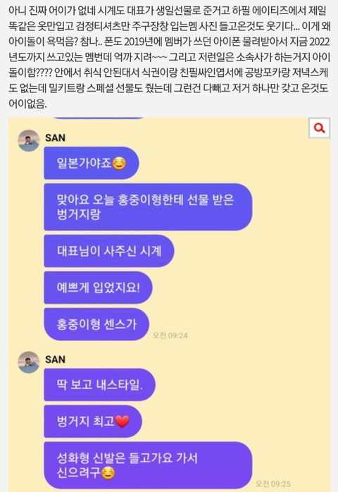 참고로 명품 벙거지는 쟤 생일날 멤버한테 받은거고, 롤렉스는 대표님이 돌린거임. 쟤 옷 저거밖에 안입고다녀. 폰도 멤버가 쓰던폰 물려받아서 쓸 정도로 검소한 애야