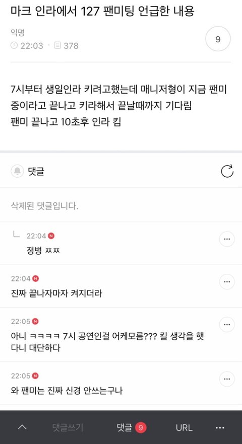 127이랑 평소에도 사적으로 안놀지만 이번에 127애들이 또 권모술수 쓸까봐 극히 거리두기하면서 지냈는데 결국 재현 자객한테 당해서 코로나 걸리고 드림콘 취소되서 그것도 비밀로 발표도 안하고 자기만 욕받이되고 부글거리는 심리를 소심한 복수로 127 팬미 불참한거 언급도 안하고 127팬 염장 지르는 버블 보낸거임