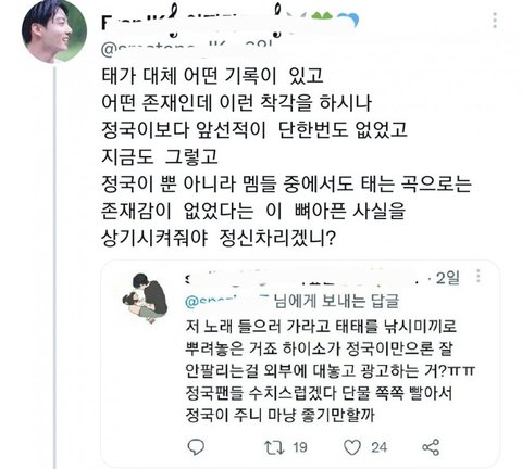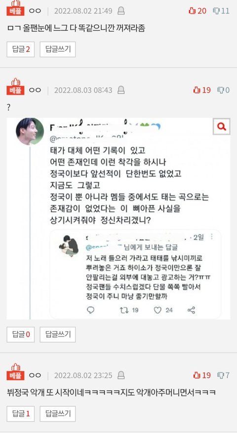 아니 한두번도 아니고 이러는데 아직도 티가 안나기를 바람?? 이 게시글도 또 우르르 몰려와서 주작할지 모르겠는데 나 이런거 캡쳐 한두개가 아님 뷔랑 정국 혹은 뷔랑 정국팬들 까는 베댓으로 주작해서 바꿔버리는거