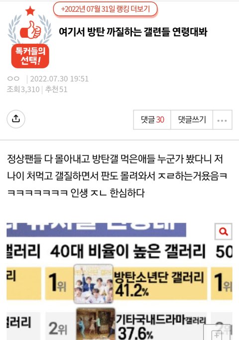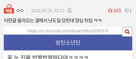 이 글 혹시 기억남? 방탄갤러리 쓰레기 갤러리로 유명하고 맨날 방탄소년단 루머 만들고 기사 제보하고 쓰레기짓하는 악플러들 소굴인거 유명함 거기 나잇대가 40대 이상이고 지들 아들뻘인 멤버들한테 그렇게 개지랄 떨고 있는거