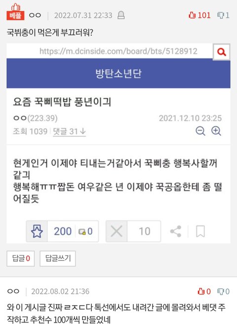 날짜 보임? 7월 31일에 톡선 올라갔던 글을 톡선 내려간 뒤에 우르르 몰려와서 베댓을 뷔랑 정국 팬들 까는 걸로 싹다 주작해서 바꿔버림