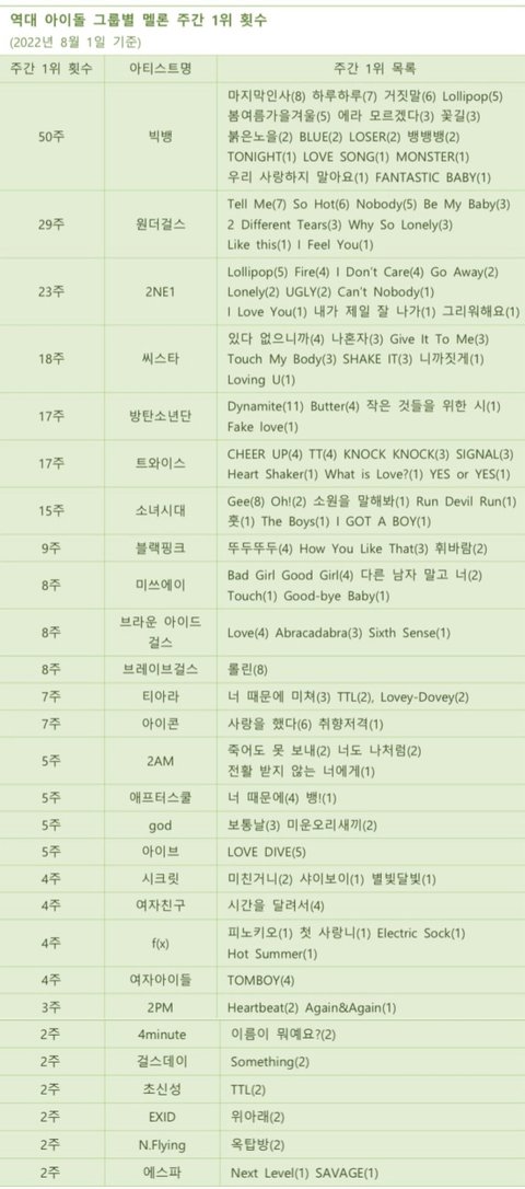 남돌 : 1위 방탄소년단 2위 엑소 3위 샤이니 4위 빅뱅 5위 지오디여돌 : 1위 소녀시대 2위 블랙핑크 3위 트와이스 4위 에스파 5위 SES