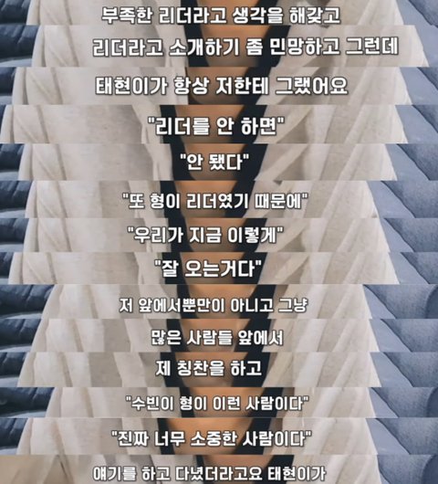 리더 수빈이 리더 역할로 의기소침해 했을 때 태현이 큰 힘이 되어주었대..ㅠㅠ 내가 다 감동