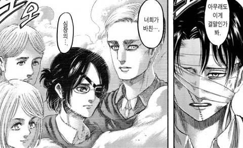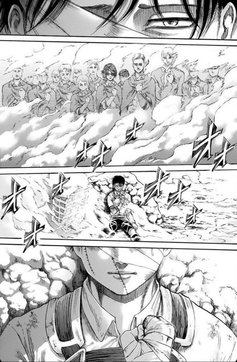 난 이거… 죽은 조사병단 애들 환상으로 보이고… 리바이가 처음으로 진중(?)하게 하는 심장을 바쳐라 포즈에다 첫 눈물묘사…ㅅㅂ 특히 저 리바이 대사 좀 현타? 온것처럼 느껴졋음 이때까지 조사병단 애들 다 뭔가 헛죽음 된거같고 그런… 너네는 뭐가 제일 슬펏냐ㅠ 사샤 환상나왔던것도… 또 미카사 머둘고 대사로 끝난 거 되게 여운남았음
