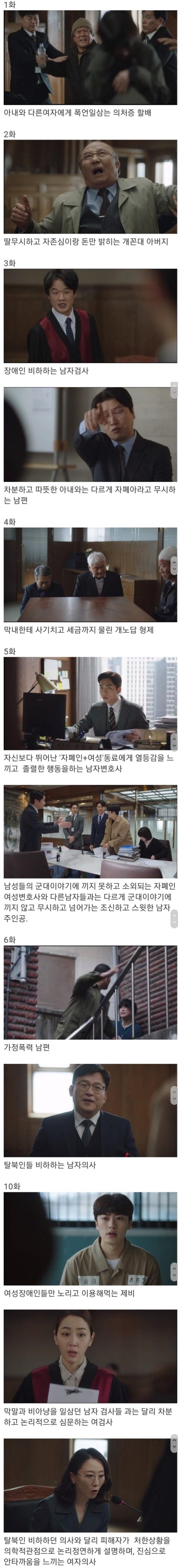 학창시절에 영우 급식실에서 의자 뺀것도 여자, 쪽지주고 키득댄것도 여자, 뺨 때린 교생도 여자 땡땡이치고 노래방 간 것도 여자, 그런 여자 끌고 가느라 힘들어한거 남자, 준호랑 영우보고 봉사 중이라고 착각해서 화이팅한거 여자, 장애인 준강간 사건때 영우한테 화낸 보호자도 여자, 권민우 이용하는 태수미도 여자, 영우 버린 태수미 여자, 그런 영우 혼자 키우느라 고생한 우광호 남자, 12화에서 위증하고 바람핀거 여자, 나중엔 협업했지만 초반에 지 혼자 살겠다고 증언한 사람도 여자다... 성별만 눈에 들어오나?