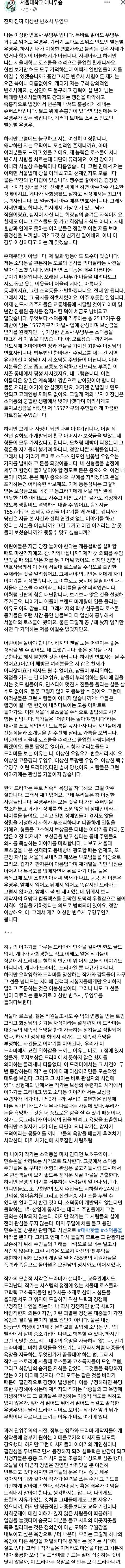 자꾸 우영우 시청자들한테 지적허영심이니, 우영우가 성역이라느니, 자폐를 이해하는 척한다느니 하는데... 내가 볼때는 오히려 이렇게 논리없이 드라마 내용도 하나 파악 못하고 쓴 글에 '서울대 대나무숲' 이라는 타이틀 하나에 자아의탁하면서 '남들과는 다르게 우영우를 비판하는 똑똑한 나'에 씨게 취한 모습이 지적허영심 그 자체 같아보임;; 아니 비판을 할거면 최소한 드라마 내용이라도 제대로 파악을 하든가;; 저 글을 잘썼다고 제대로 된 비판이라고 하는 댓글들은 대체 뭐임?? 오히려 지네가 제대로 안읽고 무지성 비난하는거 같은데ㅋㅋㅋ
