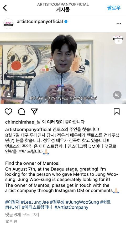 상황설명해줌----- 쓰니가 처음에 어제 이정재,정우성 나오는 영화 무대인사갔다가 정우성 봤는데 그냥 아무생각없이 멘토스 쥐고있다가 정우성이랑 악수했는데 쓰니는 줄려고 한 건 아닌데 정우성이 멘토스 자기한테 주는줄알고 가져갔다고 글 씀 정우성소속사 관계자가 그 글을 봤는지 멘토스 주인 찾는다고 올라온거임ㅋㅋㅋㅋㅋ
