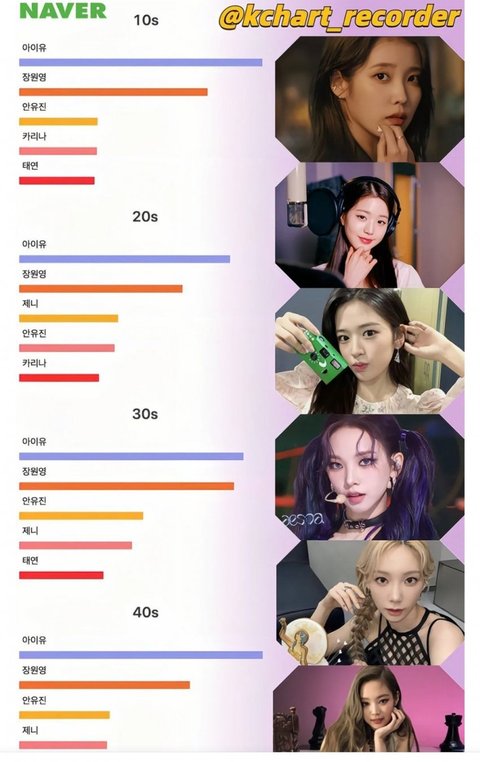 안유진, 카리나, 태연, 제니도 전연령대 상위권