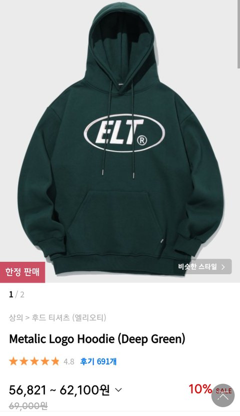 1. 엘리오티 메탈릭 로고 후디 딥그린 (사이즈s)