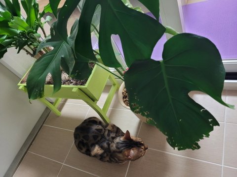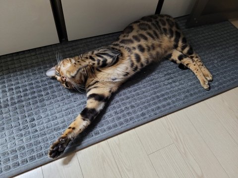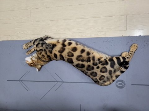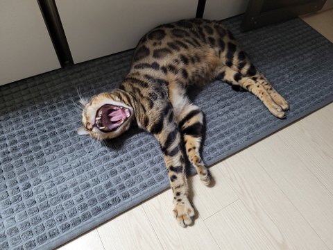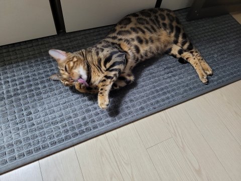 주방매트에서 자리잡고 늘어져 있는 치타!