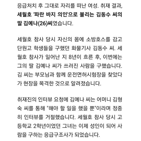 응급처치로 사람 구해,, 알고보니 '세월호 의인' 김동수씨의 딸