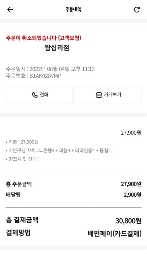 고객 요청으로 주문 취소되었습니다