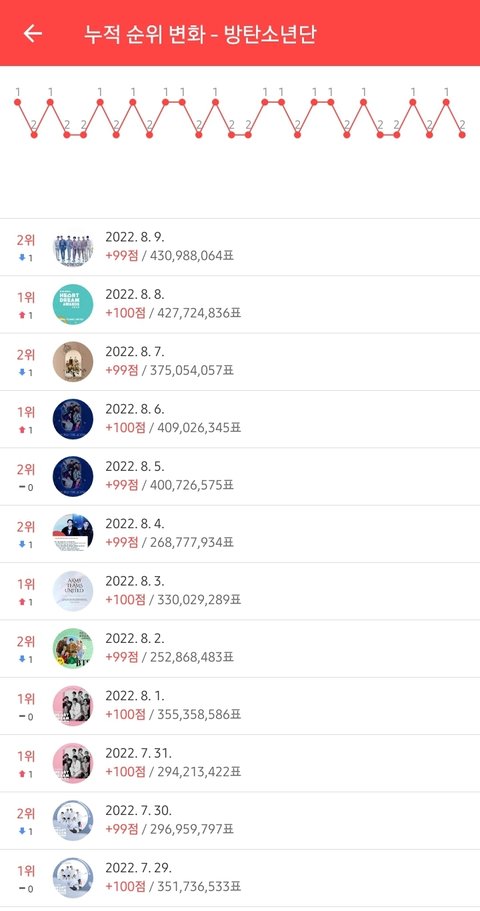 7월13일~8월 13일 한달동안 매일 11시30분에 투표 마감해서 1위 결정되고 누가 더 많이 1위 했나 누적 순위로 가리는 건데 그래프 보면 알겠지만 우리랑 저쪽이랑 거의 매일 번갈아 1위해서 현재 동점임