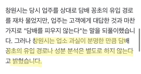 저는 1339 부정불량식품에 신고를 했었고 거기서 해당 매장 검사를 진행 하였고 가맹점주는 끝까지 담배에 대한 행동을 모두 부인했다고 합니다. 저희는 담배 유입 경로에 대해 정확히 알아보고자 치킨과 담배를 아직 보관하고 있으나, 창원시는 업소 과실이 분명한만큼 담배꽁초 유입 경로나 성분 분석을 별도로 하지 않는다고 합니다. 신고자인 저는 이 기사를 보고 알았습니다.