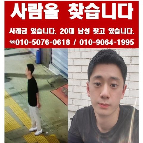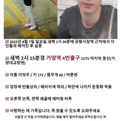 ✔️실종 당시 검정색 티셔츠에 베이지색 하의 착용 하였으며 하얀색 나이키 운동화 착용하였습니다.