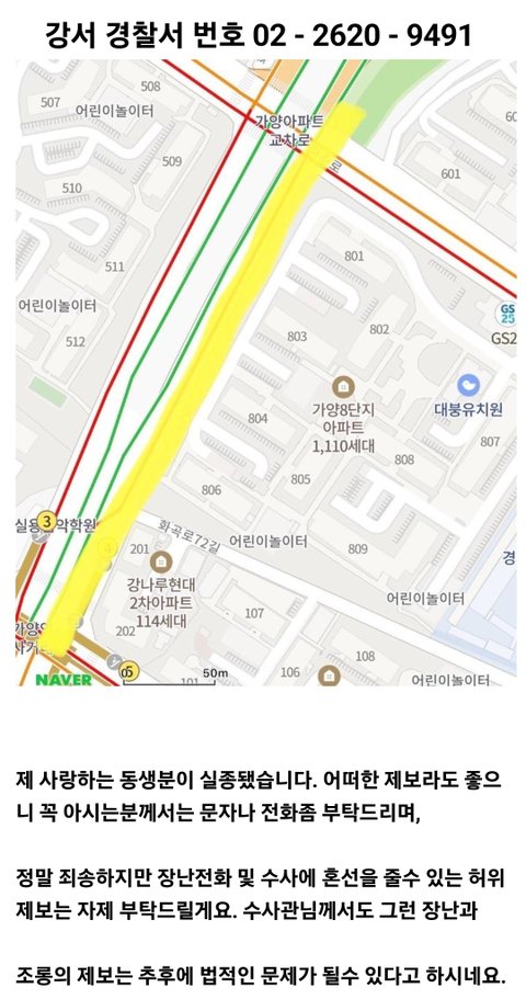 해당 시간(7일 새벽 2시15분 - 2시40분)에 위 지도의 표시된 거리나 가양대교 근방에서 목격하신 분들이나 이 후에 타지역에서 목격하신 분들 연락 부탁드리겠습니다.
