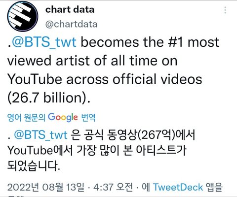 너튜브에서 공식영상이 가장 많이 조회된 아티스트 ㅊㅊㅊㅊㅊㅊㅊ