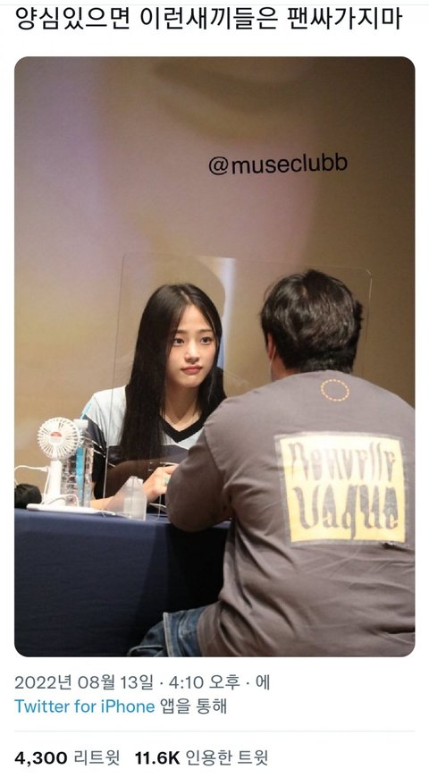 이번에 데뷔한 뉴진스 팬싸라는데 인용에 저 남팬분 욕하는거 수두룩 + 욕하는글 말리는 거 + 외퀴들이 ㅈㄹ하는거 다있음 근데 욕하는게 대부분이라 조금 놀람;; 도대체 저 남팬분이 잘못한게 뭐임..?