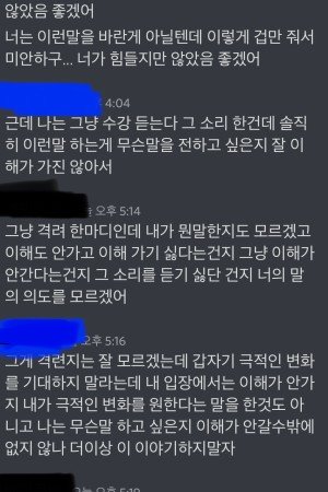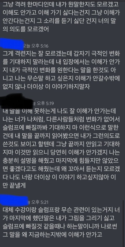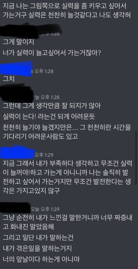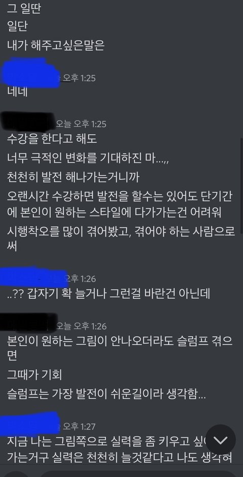 이게 누가 누군지는 못알려주고 파랑이가 그림강의를 듣기로 한 상황임.그리고 검정이가 파랑이에게 이런채팅을 보냄 파랑이는 근데 슬럼프 이야기 한적은 없음