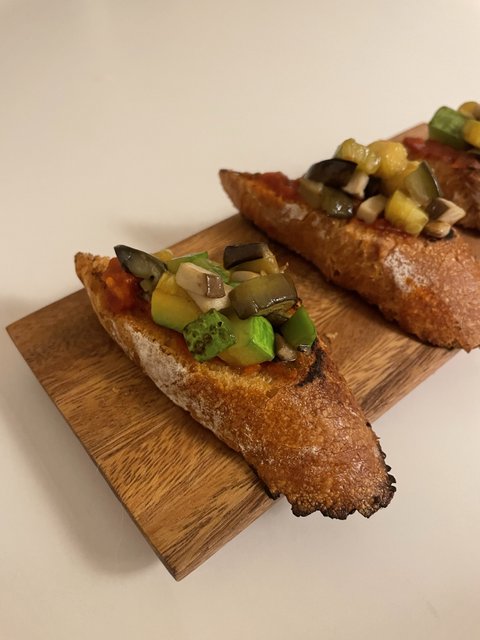 구운 야채와 토마토 페이스트를 올린 부르스케타에요! 가지랑 호박이랑 버섯을 달달 볶아 올려줬는데 다 익히면 부드러워지는 채소들이라 너무 맛있더라구요..!!
