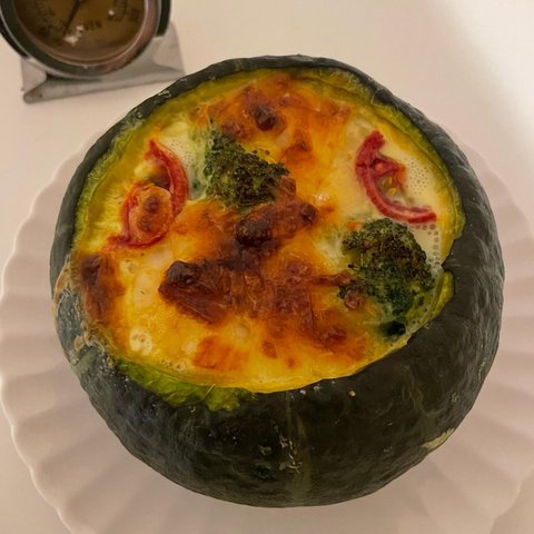 단호박 속을 파내고 치즈와 계란, 브로컬리, 양파, 새우, 토마토를 가득 채운 단호박 키쉬에요! 파이지가 아니라 건강한 느낌도 들고 담백했어요