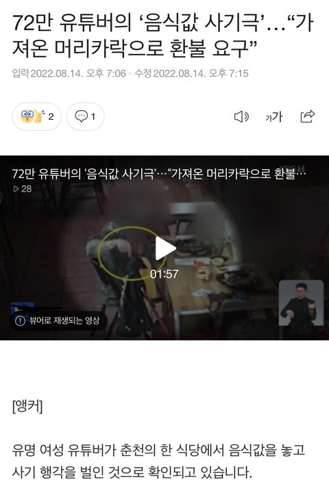어떤 여자가 음식점에서 다 먹고난 다음에 음식에 뭐 나왔다고 하고 환불 받았는데 cctv돌려보니까 자기가 이물질같은거 넣어놓고 쇼하는거였음.. 근데 한두번이 아니래