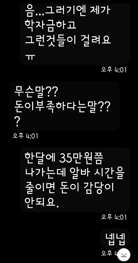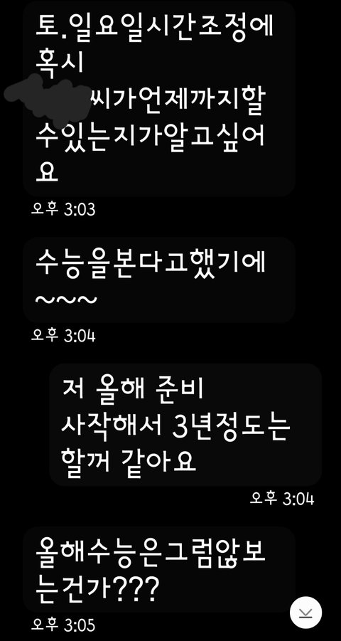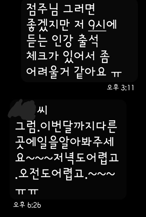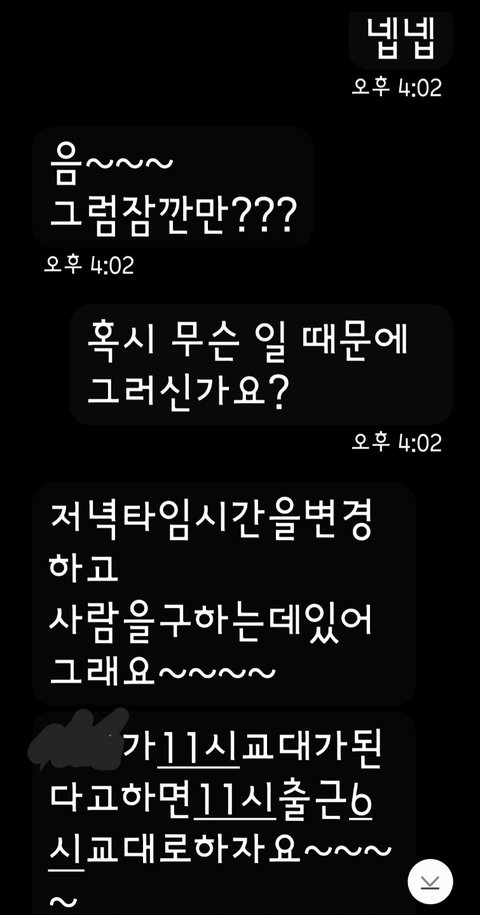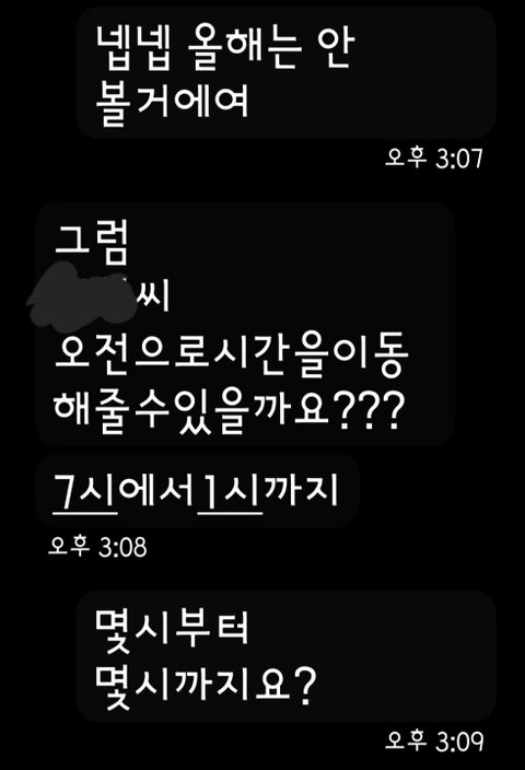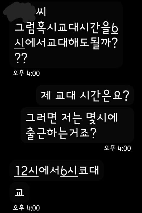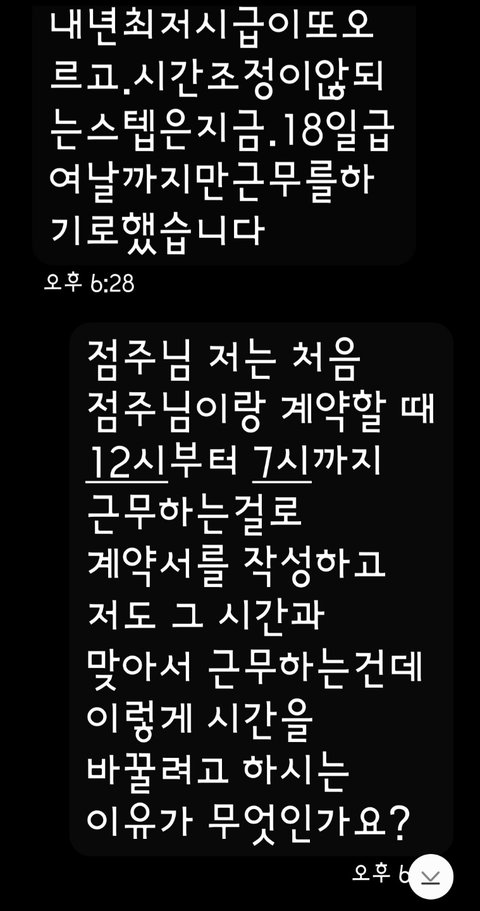 몇일 전 제가 이런 일을 겪었는데 여러분들도 이런일을 조심하시길 바라는 심정으로 글을 적습니다.저는 ㄱㅊ에 있는 대학 후문 근처에 있는 Cㅇ 편의점에서 주말 낮 12시부터 7시까지 일을 했습니다.그리고 근로 계약서 작성할 때도 저 시간으로 해서 작성했었고 수습기간 3개월 계약하고 들어갔습니다.그렇게 알바를 시작한지 1달 반쯤에 편의점 점장님께 이런 문자가 왔습니다.